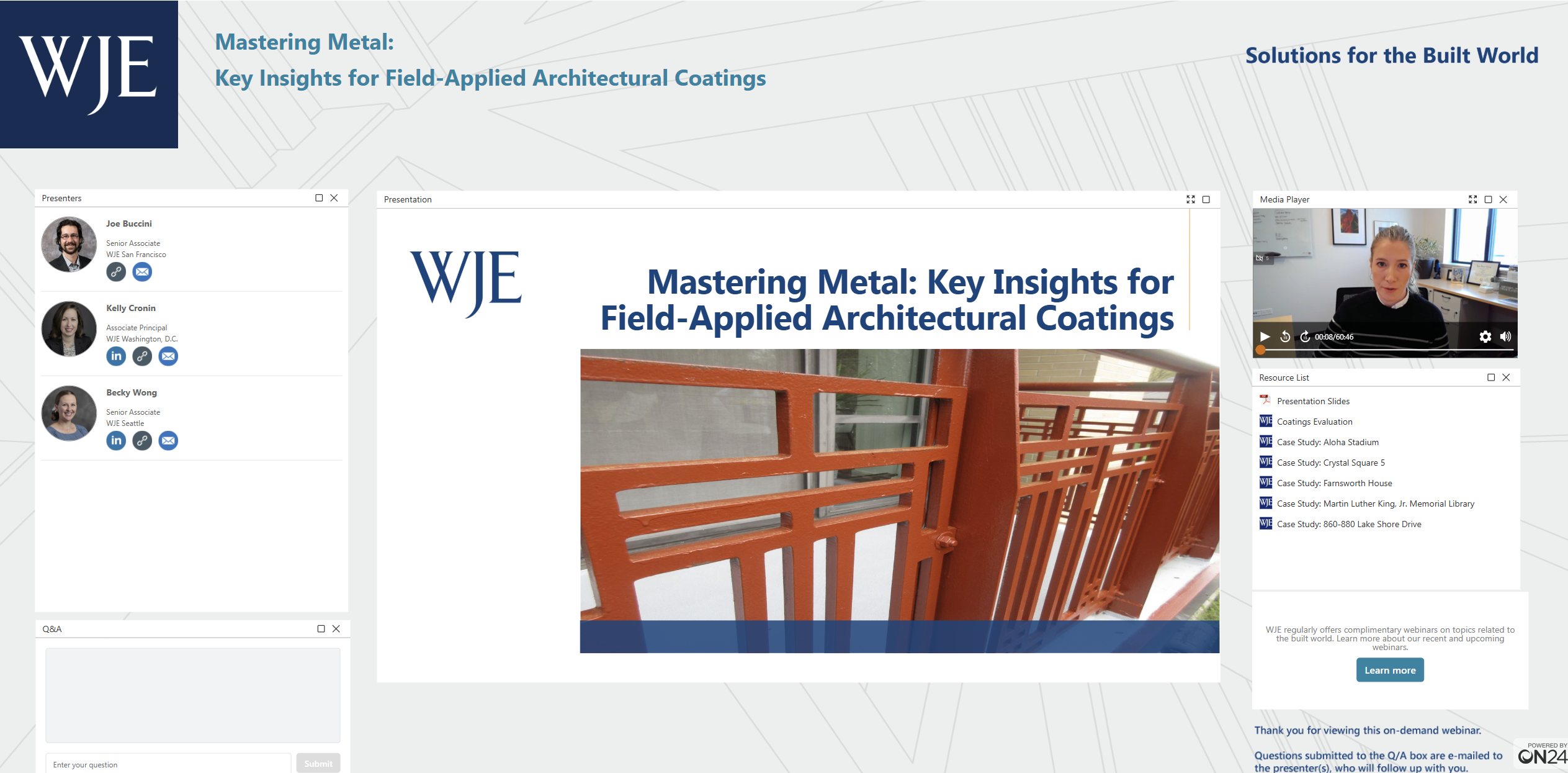 In this webinar, architect Joe Buccini, engineer Kelly Cronin, and architectural conservator Becky Wong explore the critical role of coatings on metal substrates, specifically metals that are architectural/non-structural. Learn how to assess coating performance, identify signs of damage or distress, and evaluate repair strategies. The presentation covers key considerations for overcoating and recoating, offering practical guidance for design and installation to ensure long-term success in the field.